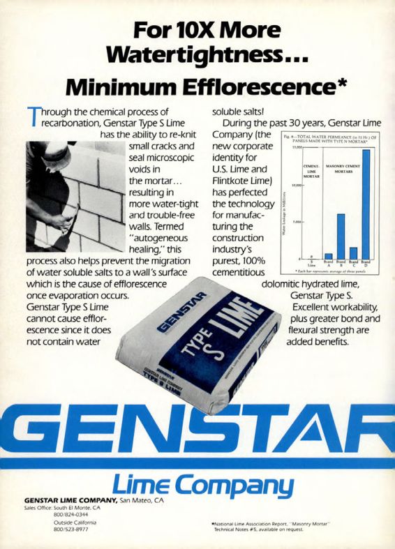 During the past 30 years, Genstar Lime Company (the new corporate identity for U.S. Lime and Flintkote Lime) has perfected the technology for manufacturing the construction industry's purest, 100% cementitious dolomitic hydrated lime, Genstar Type S. Excellent workability, plus greater bond and flexural strength are added benefits.
