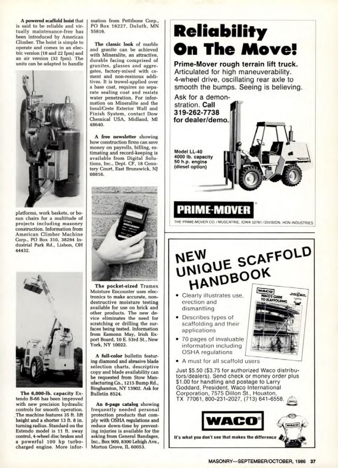 A powered scaffold hoist that is said to be reliable and virtually maintenance-free has been introduced by American Climber. The hoist is simple to operate and comes in an electric version (18 and 22 fpm) and an air version (32 fpm). The units can be adapted to handle platforms, work baskets, or bosun chairs for a multitude of projects including masonry construction. Information from American Climber Machine Corp., PO Box 310, 38294 Industrial Park Rd., Lisbon, OH 44432.