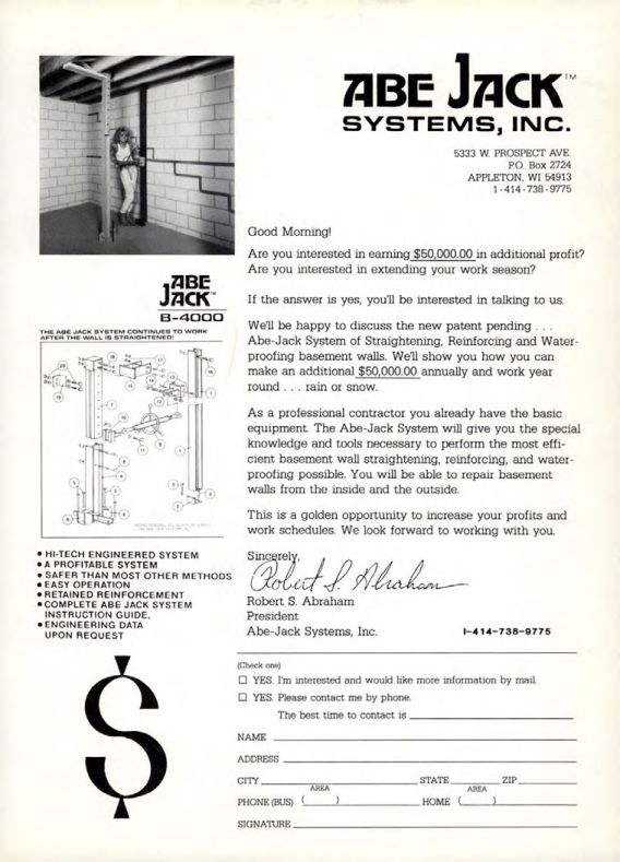 We'll be happy to discuss the new patent pending... Abe-Jack System of Straightening, Reinforcing and Waterproofing basement walls. We'll show you how you can make an additional $50,000.00 annually and work year round rain or snow.