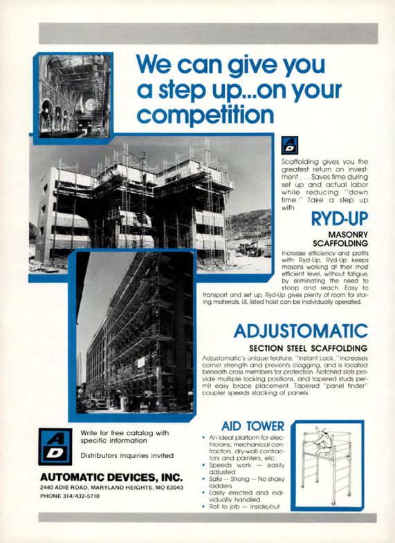 An ideal platform for electricians, mechanical contractors, dry-wall contractors and painters, etc. Speeds work adjusted easily. Safe-Strong - No shaky ladders. Easily erected and individually handled. Roll to job inside/out.