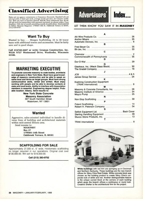 Rates net; no agency commission or frequency discounts. Standard ads are set 8-pt.solid, & lines per inch: average words per line: 10. Column width: 31%. Rate per inch or fraction thereof: $20.00. Each additional line: $2.00. All ads must be typewritten with payment enclosed; no phone orders. Copy deadline: 15th day of month preceding month of publication. Send material to: Editor, Masonry Magazine. 17W601-14th St., Cakbrook Terrace, II. 60181. (312) 620-6767.