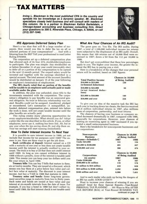 Irving L. Blackman is the most published CPA in the country and spreads his tax knowledge as a dynamic speaker. Mr. Blackman specializes in closely held businesses and will consult with readers of this column. He is a partner in Blackman Kallick Bartelstein, a Chicago-based accounting and business consulting firm. Direct your questions to 300 S. Riverside Plaza, Chicago, IL 60606, or call (312) 207-1040.