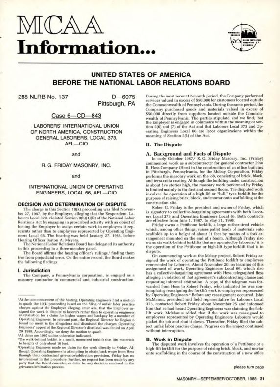 In early October 1987, R. G. Friday Masonry, Inc. (Friday) commenced work as a subcontractor for general contractor John R. Hess Company (Hess) in the construction of an office building in Pittsburgh, Pennsylvania, for the Mobay Corporation. Friday performs the masonry work on the job, consisting of brick, block, and terra-cotta coating. Although the building under construction is about five stories high, the masonry work performed by Friday is limited mainly to the first and second floors. The disputed work involves the operation of a high-lift or "lull" type forklift for the purpose of raising brick, block, and mortar onto scaffolding at the construction site.