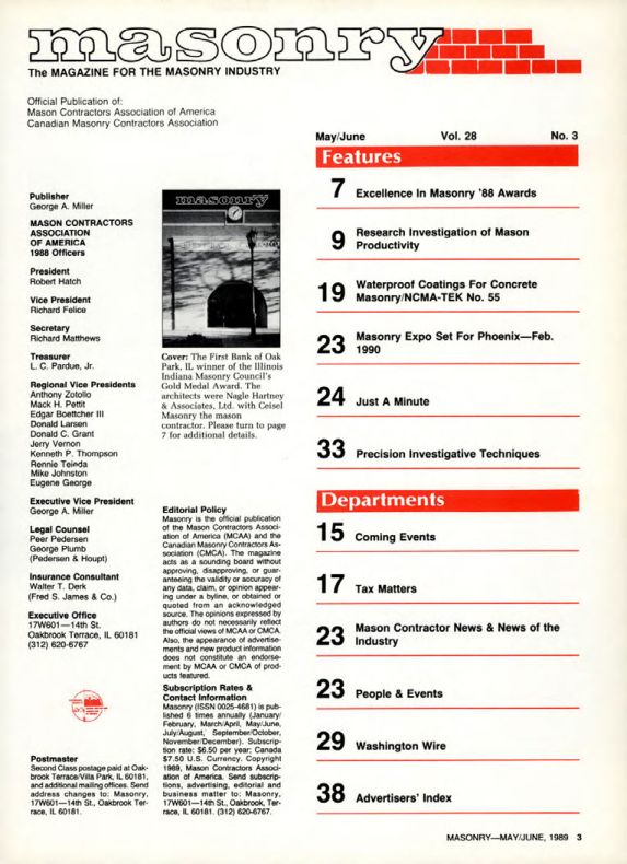 Masonry (ISSN 0025-4681) is published 6 times annually (January/February, March/April, May/June, July August, September October, November December). Subscription rate: $6.50 per year, Canada $7.50 U.S. Currency. Copyright 1989, Mason Contractors Association of America. Send subscriptions, advertising, editorial and business matter to: Masonry. 17W601-14th St., Oakbrook, Terrace, IL 60181. (312) 620-6767.