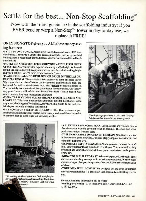 This saves a tremendous amount of time for the laborers. Since they are not building scaffolds all day, they have little else to do but feed your bricklayers materials and raise the scaffold.