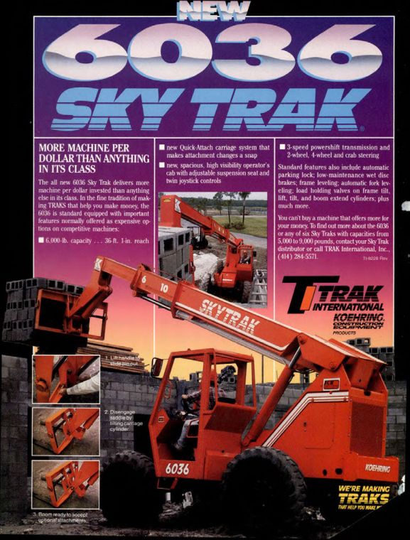 You can't buy a machine that offers more for your money. To find out more about the 6036 or any of six Sky Traks with capacities from 5,000 to 9,000 pounds, contact your Sky Trak distributor or call TRAK International, Inc., (414) 284-5571.
