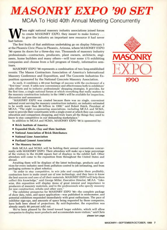 "MASONRY EXPO was created because there was no single, convenient national event serving the masonry construction industry, an industry estimated to be worth more than $6 billion in 1990," said Robert Hatch. President of MCAA, "The eight co-sponsoring associations, including MCAA and NCMA, want to provide their constituents with a single event at which they can combine education and comparison shopping, and truly learn all the things they need to know to stay competitive in our demanding marketplace."