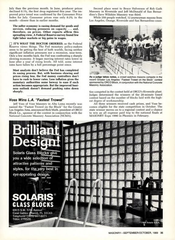 Jeff Voss of Voss Masonry in Alta Loma recently was named the "Fastest Trowel on the Block" for the Greater Los Angeles Area, announced Rick Muth, president of ORCO Block Co., sponsor of the contest in conjunction with the National Concrete Masonry Association (NCMA).