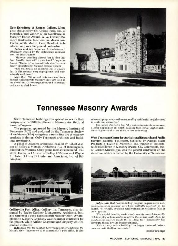 West Tennessee Center for Agricultural Research and Public Service, Jackson, Tennessee, designed by Nathan Evans Products & Taylor of Memphis, and winner of the statewide Excellence in Masonry Award. CIG Contractors, Inc.. of Corinth, Mississippi, was the general contractor on the structure, which is owned by the University of Tennessee.