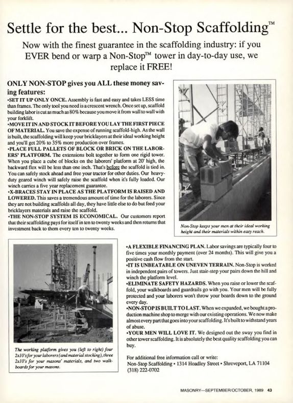 •MOVE IT IN AND STOCK IT BEFORE YOU LAY THE FIRST PIECE OF MATERIAL. You save the expense of running scaffold-high. As the wall is built, the scaffolding will keep your bricklayers at their ideal working height and you'll get 20% to 35% more production over frames.