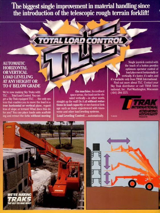 Single joystick control with the touch of a button provides optimum operator control of load placement horizontally or vertically. It's faster, it's safer, and it's available only from TRAK International. Find out more about TLC. Contact your Sky Trak distributor or call TRAK International, Inc., Port Washington, Wisconsin (414) 284-5571.