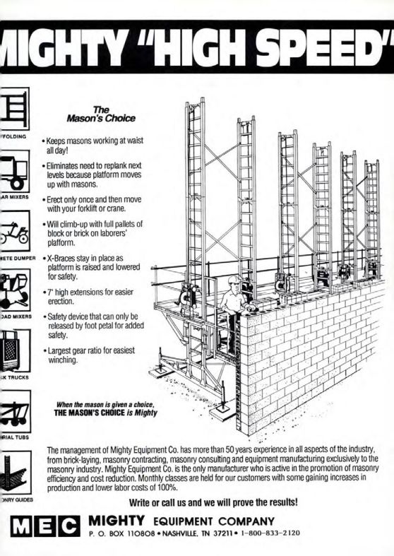 The management of Mighty Equipment Co. has more than 50 years experience in all aspects of the industry, from brick-laying, masonry contracting, masonry consulting and equipment manufacturing exclusively to the masonry industry. Mighty Equipment Co. is the only manufacturer who is active in the promotion of masonry efficiency and cost reduction. Monthly classes are held for our customers with some gaining increases in production and lower labor costs of 100%.
