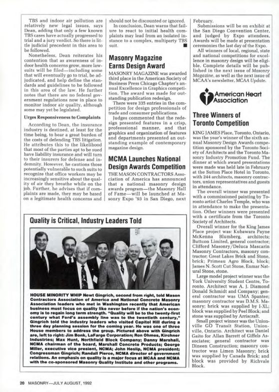 HOUSE MINORITY WHIP Newt Gingrich, second from right, told Mason Contractors Association of America and National Concrete Masonry Association leaders who met in Washington recently that American business must focus on quality like never before if the nation's economy is to regain long term strength. "Quality will be to the twenty-first century what Ford's assembly line was to the twentieth century," Gingrich told the industry leaders who visited Capitol Hill during a three day planning session for the coming year. He was one of three House members to address the group. Pictured above with Gingrich are, left to right: Jim Bonk, LaFarge Corporation; Ron Ohmes, Kirchner Industries; Max Hunt, Northfield Block Company; Danny Marshall, NCMA chairman of the board, Marshall Concrete Products; George Miller, executive vice president, NCMA; John Heslip, NCMA president; Congressman Gingrich; Randall Pierce, NCMA director of government relations. An emphasis on quality is a major focus at MCAA and NCMA with the co-sponsored Masonry Quality Institute and other programs.