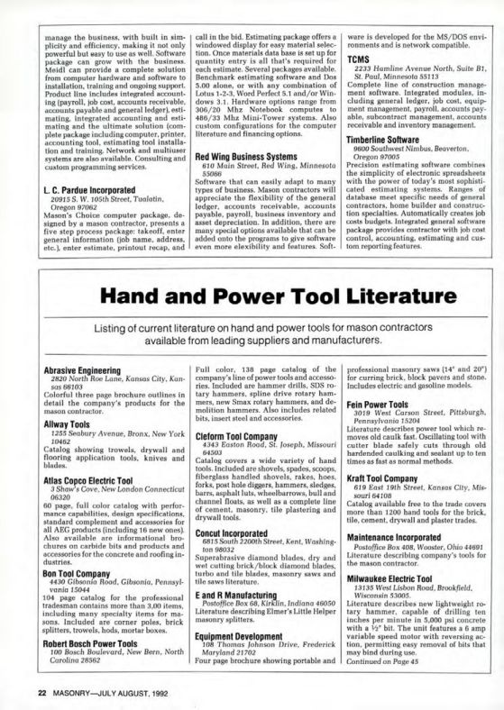 Listing of current literature on hand and power tools for mason contractors available from leading suppliers and manufacturers.