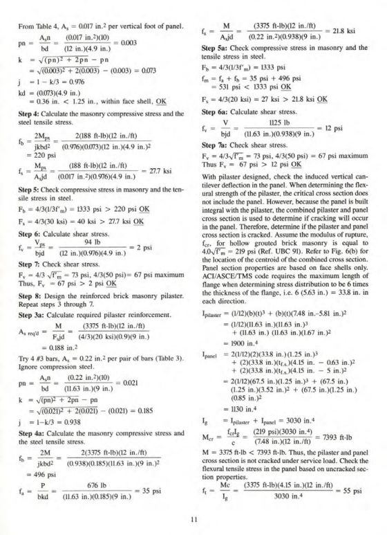With pilaster designed, check the induced vertical can- tilever deflection in the panel. When determining the flex- ural strength of the pilaster, the critical cross section does not include the panel. However, because the panel is built integral with the pilaster, the combined pilaster and panel cross section is used to determine if cracking will occur in the panel. Therefore, determine if the pilaster and panel cross section is cracked. Assume the modulus of rupture, fer. for hollow grouted brick masonry is equal to 4.0 fm = 219 psi (Ref. UBC 91). Refer to Fig. 6(b) for the location of the centroid of the combined cross section. Panel section properties are based on face shells only. ACI/ASCE/TMS code requires the maximum length of flange when determining stress distribution to be 6 times the thickness of the flange, i.e. 6 (5.63 in.) = 33.8 in. in each direction.