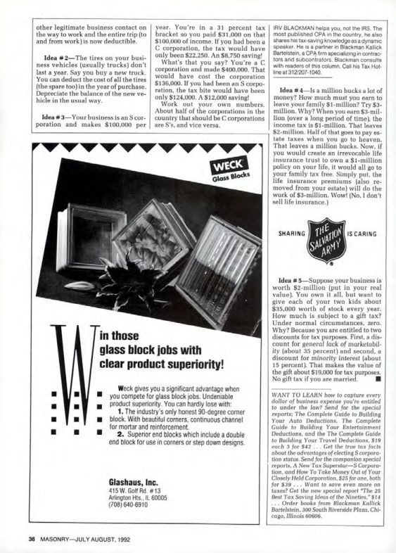 WANT TO LEARN how to capture every dollar of business expense you're entitled to under the law? Send for the special reports; The Complete Guide to Building Your Auto Deductions, The Complete Guide to Building Your Entertainment Deductions, and the The Complete Guide to Building Your Travel Deductions, $19 each 3 for $42... Get the true tax facts about the advantages of electing S corporation status. Send for the companion special reports, A New Tax Superstar-S Corporation, and How To Take Money Out of Your Closely Held Corporation, $25 for one, both for $39... Want to save even more on taxes? Get the new special report "The 25 Best Tax Saving Ideas of the Nineties," $14 Order books from Blackman Kallick Bartelstein, 300 South Riverside Plaza, Chicago, Illinois 60606.