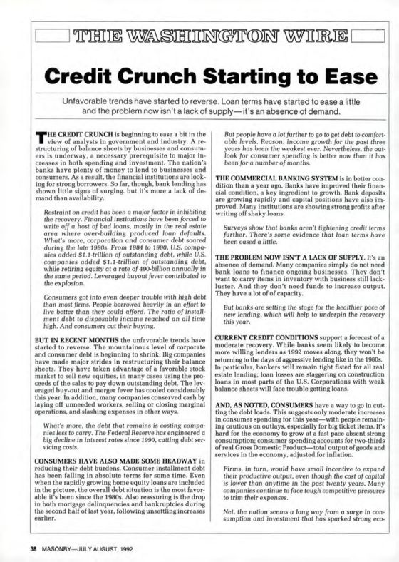 THE CREDIT CRUNCH is beginning to ease a bit in the view of analysts in government and industry. A restructuring of balance sheets by businesses and consumers is underway, a necessary prerequisite to major increases in both spending and investment. The nation's banks have plenty of money to lend to businesses and consumers. As a result, the financial institutions are looking for strong borrowers. So far, though, bank lending has shown little signs of surging. but it's more a lack of demand than availability.