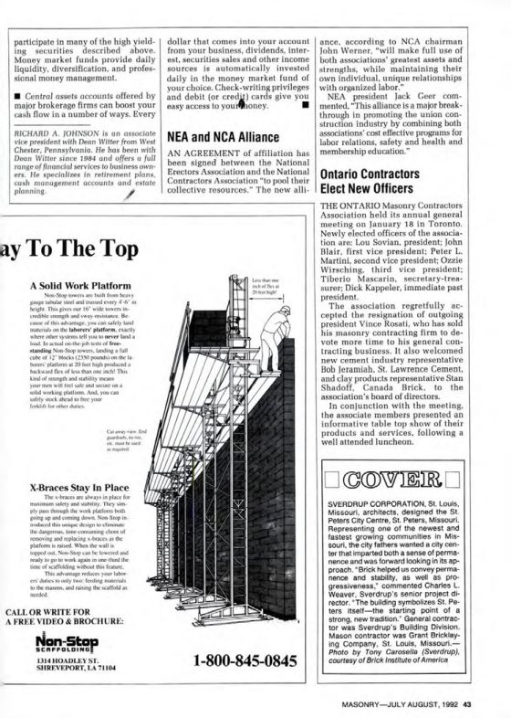 The association regretfully accepted the resignation of outgoing president Vince Rosati, who has sold his masonry contracting firm to devote more time to his general contracting business. It also welcomed new cement industry representative Bob Jeramiah, St. Lawrence Cement, and clay products representative Stan Shadoff, Canada Brick, to the association's board of directors.