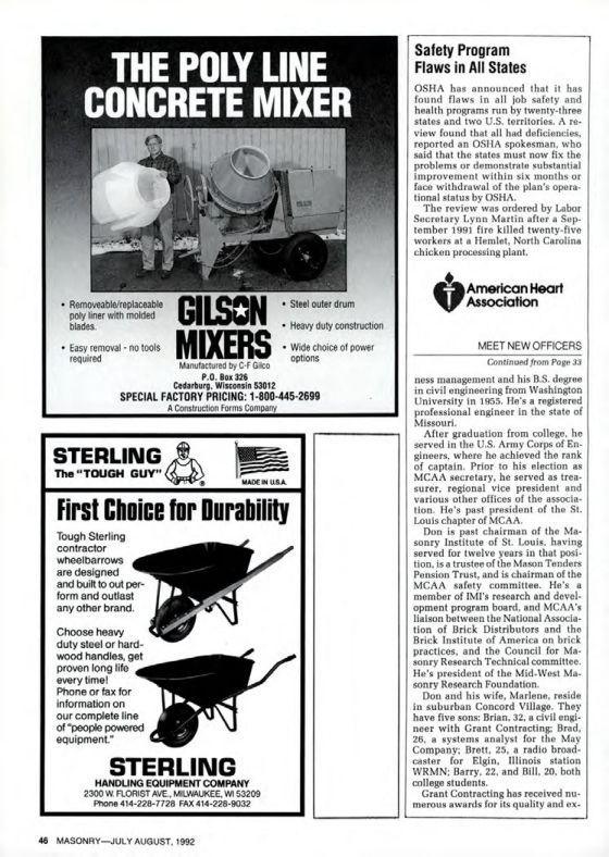 Don is past chairman of the Masonry Institute of St. Louis, having served for twelve years in that position, is a trustee of the Mason Tenders Pension Trust, and is chairman of the MCAA safety committee. He's a member of IMI's research and development program board, and MCAA's liaison between the National Association of Brick Distributors and the Brick Institute of America on brick practices, and the Council for Masonry Research Technical committee. He's president of the Mid-West Masonry Research Foundation.