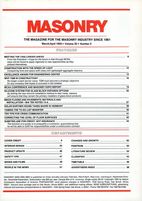 MASONRY (ISSN 0025-4681) is published six times annually (January/ February, March/April, May/June, July/August, September/October, November/December). Subscription rate $20 per year; Canada $24 (U.S. currency). Single copies $3.50. Copyright 1993 by Mason Contractors Association of America. POSTMASTER: send address changes to MASONRY, 1550 Spring Road, Oak Brook, Illinois 60521. Second class postage paid at Oak Brook, Illinois 60521, and additional mailing offices. SEND SUBSCRIPTIONS, advertising, editorial and business correspondence to: MASONRY, 1550 Spring Road, Oak Brook, IL 60521. Phone 708/782-6767. Fax 708/782-6786.