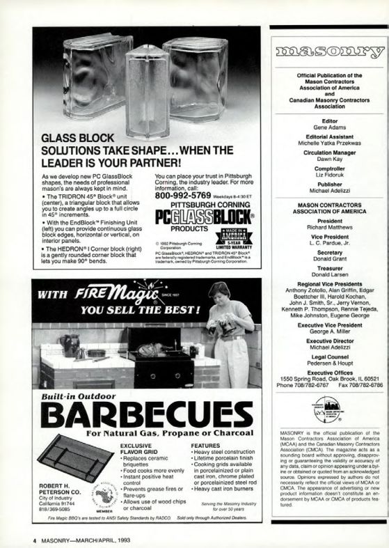 MASONRY is the official publication of the Mason Contractors Association of America (MCAA) and the Canadian Masonry Contractors Association (CMCA). The magazine acts as a sounding board without approving, disapproving or guaranteeing the validity or accuracy of any data, claim or opinion appearing under a byline or obtained or quoted from an acknowledged source. Opinions expressed by authors do not necessarily reflect the official views of MCAA or CMCA. The appearance of advertising or new product information doesn't constitute an endorsement by MCAA or CMCA of products featured.