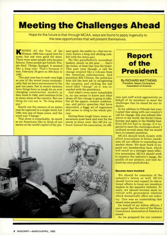 We should be conscious of the industry's future as well. MCAA should revive and expand its educational efforts to keep our members leaders in the masonry industry. Finally, we should become more involved with government relations which dramatically affect our industry. This was an undertaking that raised some questions.