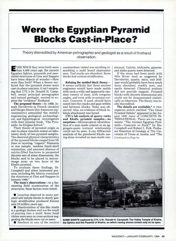 The details are available. A two-segment article entitled "The Great Pyramid Debate" appeared in the August 1991 issue of CONCRETE INTERNATIONAL. There are two segments: "The Ancient Egyptian Pyramids-Concrete or Rock?" by Drs. Campbell and Robert L. Folk, Professor Emeritus of Geology at The University of Texas at Austin, and "The