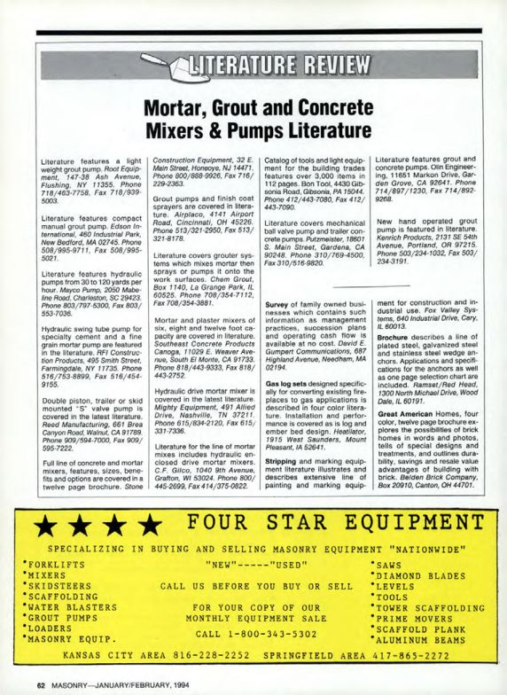 Full line of concrete and mortar mixers, features, sizes, bene fits and options are covered in a twelve page brochure. Stone Construction Equipment, 32 E. Main Street, Honeoye, NJ 14471. Phone 800/888-9926, Fax 716/229-2363.