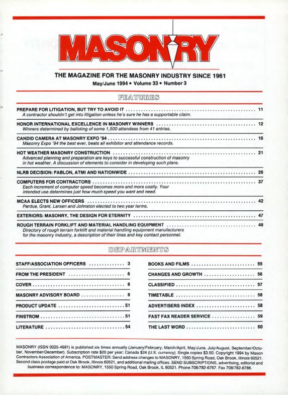 MASONRY (ISSN 0025-4681) is published six times annually (January/February, March/April, May/June, July/August, September/October, November/December). Subscription rate $20 per year; Canada $24 (U.S. currency). Single copies $3.50. Copyright 1994 by Mason Contractors Association of America. POSTMASTER: Send address changes to MASONRY, 1550 Spring Road, Oak Brook, Illinois 60521. Second class postage paid at Oak Brook, Illinois 60521, and additional mailing offices. SEND SUBSCRIPTIONS, advertising, editorial and business correspondence to: MASONRY, 1550 Spring Road, Oak Brook, IL 60521. Phone 708/782-6767. Fax 708/782-6786.