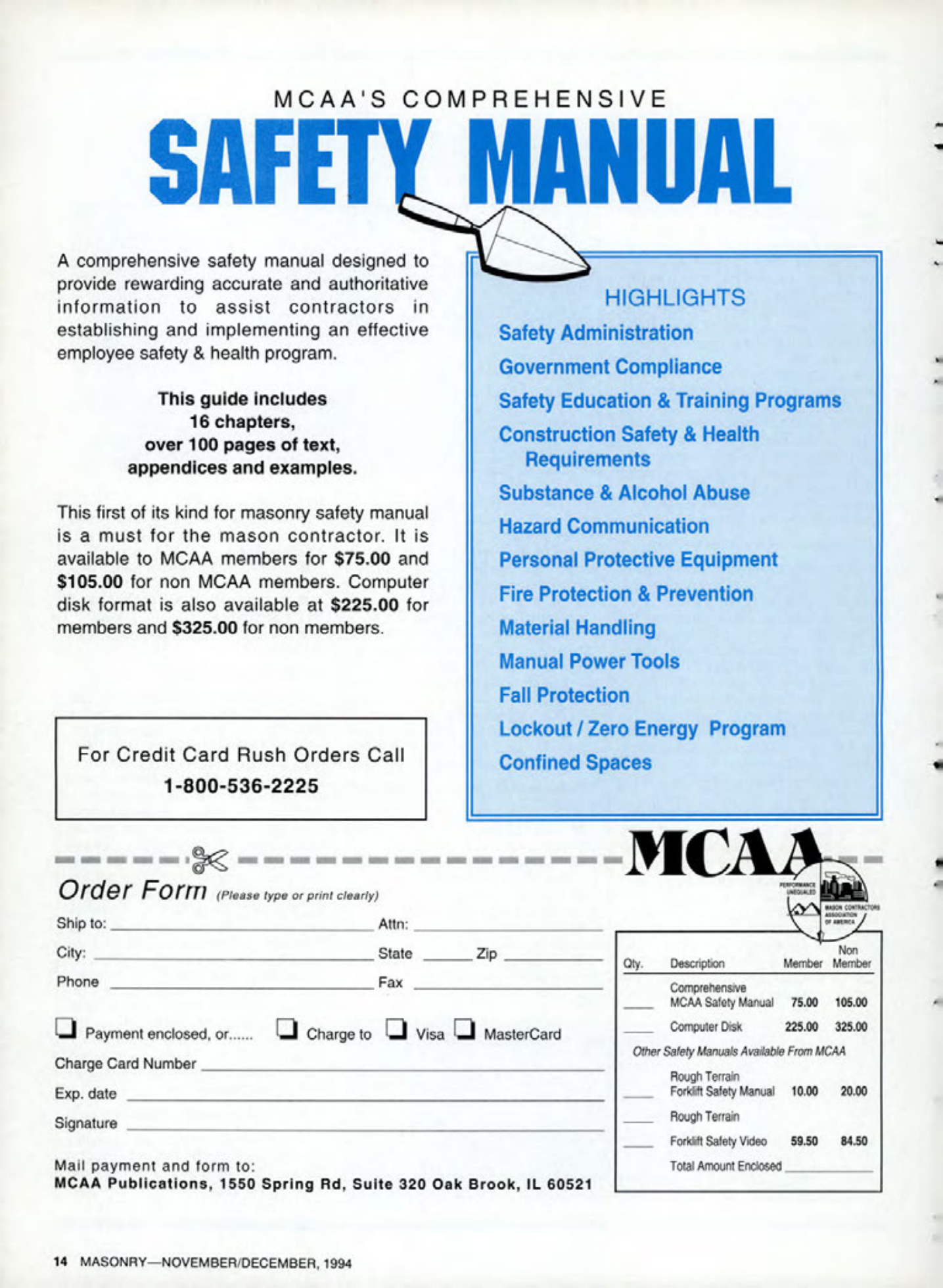 This first of its kind masonry safety manual is a must for the mason contractor. It is available to MCAA members for $75.00 and $105.00 for non MCAA members. Computer disk format is also available at $225.00 for members and $325.00 for non members.