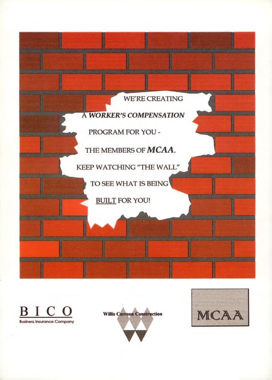 Masonry Magazine December 1995 Page. 44 Masonry Magazine December 1995 Page. 44 BICOBusiness Insurance Company WE'RE CREATINGA WORKER'S COMPENSATION PROGRAM FOR YOU - THE MEMBERS OF MCAA. KEEP WATCHING "THE WALL" TO SEE WHAT IS BEING BUILT FOR YOU! Willis Corroon Construction MCAA