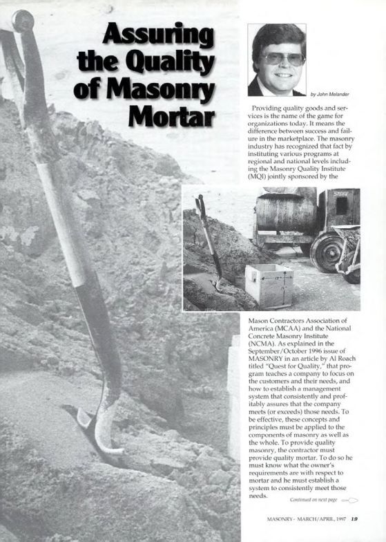 Providing quality goods and services is the name of the game for organizations today. It means the difference between success and failure in the marketplace. The masonry industry has recognized that fact by instituting various programs at regional and national levels including the Masonry Quality Institute (MQI) jointly sponsored by the Mason Contractors Association of America (MCAA) and the National Concrete Masonry Institute (NCMA). As explained in the September/October 1996 issue of MASONRY in an article by Al Roach titled "Quest for Quality," that program teaches a company to focus on the customers and their needs, and how to establish a management system that consistently and profitably assures that the company meets (or exceeds) those needs. To be effective, these concepts and principles must be applied to the components of masonry as well as the whole. To provide quality masonry, the contractor must provide quality mortar. To do so he must know what the owner's requirements are with respect to mortar and he must establish a system to consistently meet those needs.