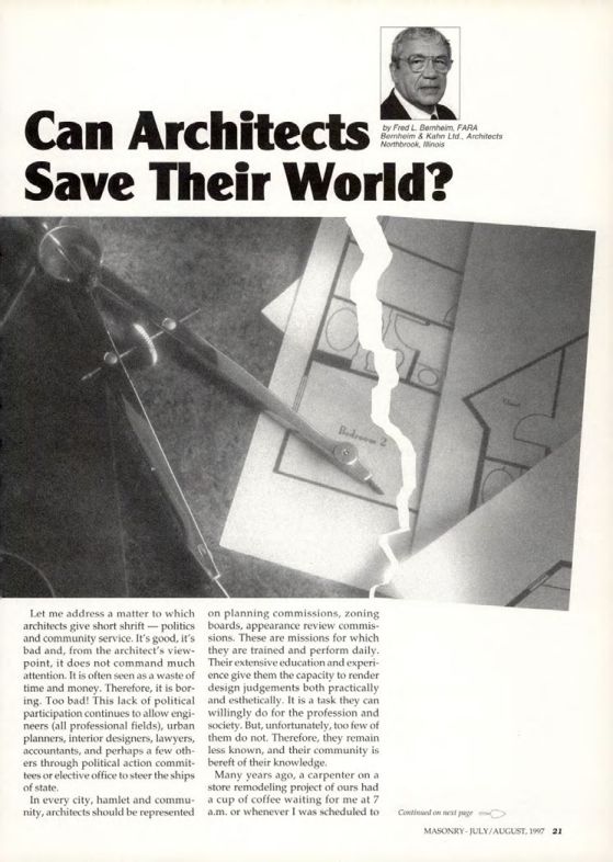 Let me address a matter to which architects give short shrift: politics and community service. It's good, it's bad and, from the architect's viewpoint, it does not command much attention. It is often seen as a waste of time and money. Therefore, it is boring. Too bad! This lack of political participation continues to allow engineers (all professional fields), urban planners, interior designers, lawyers, accountants, and perhaps a few others through political action committees or elective office to steer the ships of state.