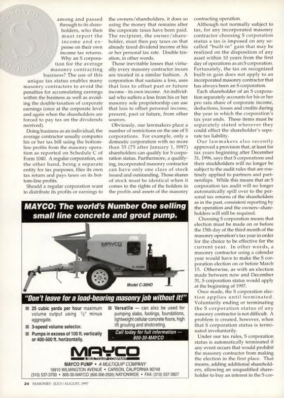 Choosing S corporation means that election must be made on or before the 15th day of the third month of the masonry operation's tax year in order for the choice to be effective for the current year. In other words, a masonry contractor using a calendar year would have to make the S corporation election on or before March 15. Otherwise, as with an election made between now and December 31, S corporation status would apply at the beginning of 1997.