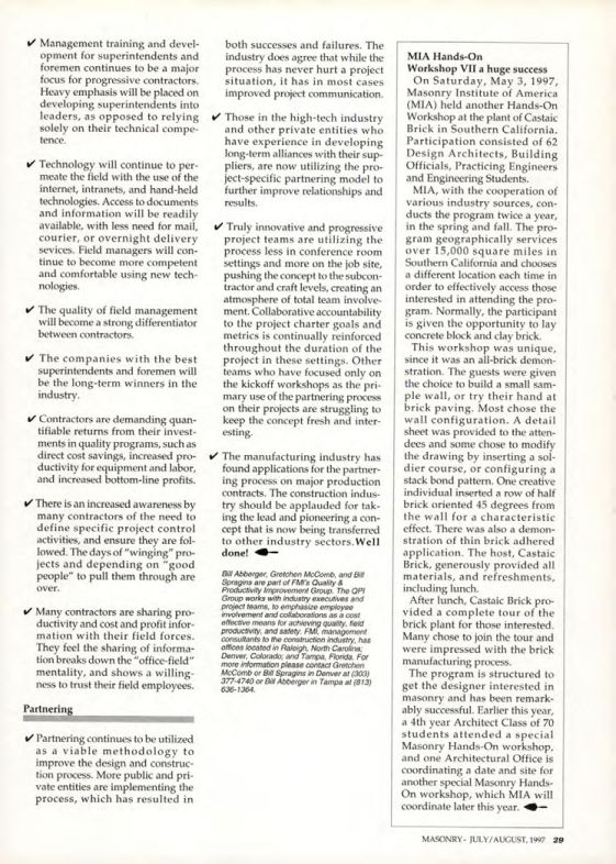 On Saturday, May 3, 1997, Masonry Institute of America (MIA) held another Hands-On Workshop at the plant of Castaic Brick in Southern California. Participation consisted of 62 Design Architects, Building Officials, Practicing Engineers and Engineering Students. MIA, with the cooperation of various industry sources, conducts the program twice a year, in the spring and fall. The program geographically services over 15,000 square miles in Southern California and chooses a different location each time in order to effectively access those interested in attending the program. Normally, the participant is given the opportunity to lay concrete block and clay brick. This workshop was unique, since it was an all-brick demonstration. The guests were given the choice to build a small sample wall, or try their hand at brick paving. Most chose the wall configuration. A detail sheet was provided to the attendees and some chose to modify the drawing by inserting a soldier course, or configuring a stack bond pattern. One creative individual inserted a row of half brick oriented 45 degrees from the wall for a characteristic effect. There was also a demonstration of thin brick adhered application. The host, Castaic Brick, generously provided all materials, and refreshments, including lunch. After lunch, Castaic Brick provided a complete tour of the brick plant for those interested. Many chose to join the tour and were impressed with the brick manufacturing process. The program is structured to get the designer interested in masonry and has been remarkably successful. Earlier this year, a 4th year Architect Class of 70 students attended a special Masonry Hands-On workshop, and one Architectural Office is coordinating a date and site for another special Masonry Hands-On workshop, which MIA will coordinate later this year.