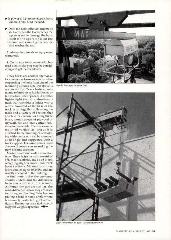 Track hoists are another alternative for contractors to use especially when suspending the hoist from one of the mounting options detailed above is not an option. Track hoists, commonly referred to as ladder hoists or ladavators, incorporate durable, lightweight (usually aluminum) track that resembles a ladder with a motor mounted at the base of the track, a carriage that rolls along the track and a variety of baskets that attach to the carriage for lifting brick, block, mortar, sheets of plywood or drywall, tile and many other construction materials. The track can be mounted vertical as long as it is attached to the building or scaffolding with clamps or it can be mounted at an angle and supported with a track support. The same points listed above will ensure you are making the right hoisting decision.