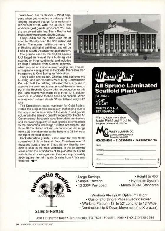 Watertown, South Dakota - What happens when you combine a uniquely challenging museum design for a nationally renowned artist, with the skills of the world's largest granite producer? You create an award winning Terry Redlin Art Museum in Watertown, South Dakota. Terry Redlin cut the ribbon June 7th at noon to officially open the $10 million Art Center. The museum will house nearly 100 of Redlin's original oil paintings, and will be home to South Dakota's first planetarium. The granite used in the 52,000 square foot Egyptian revival style building was quarried on three continents, and includes 24 large Rockville white Granite columns, which support an immense overhanging roof. The column granite was quarried in Rockville, Minnesota then transported to Cold Spring for fabrication. Terry Redlin and his son, Charles, who designed the building, and representatives of Gray Construction Co., who built the building, all visited the quarry site to approve the color and to assure confidence in the output of the Rockville Quarry prior to production for this job. Each column was made up of three 10'-8" column sections, in addition to their base and capitols. When erected each column stands 38 feet tall and weighs 20 tons. Ted Krebsbach, sales manager for Cold Spring, stated the project was especially challenging due to the scope and uniqueness of the work. "Solid granite columns in the size and quantity required for Redlin Art Center are not frequently used in modern architecture and the tapering quality of each granite column added to the production challenge," stated Krebsbach. The three 10-foot 8-inch column sections when set range from a 36-inch diameter at the bottom to 28 inches at the top of the third section. Rockville White granite is also used for over 9,000 square feet of tile on the main floor. Elsewhere, over 10 thousand square feet of Black Galaxy Granite from India is used in the main vestibule, in the art viewing areas and in the exhibit area of the planetarium. On the walls in the art viewing areas, there are approximately 5900 square feet of Impala Granite from Africa also featured.