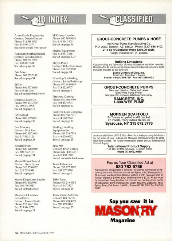 Rates are net and payable in advance. No agency commission or frequency discounts. Standard ads are set 8 point solid, 8 lines per inch; 10 average words per line. Column width is 3 3/8". Rates per inch or fraction thereof is $30.00. Each additional line is $3.00. All ads must be typewritten. Copy deadline: 1st of month two months prior to month of publication. Send materials to: Editor, Masonry Magazine. 1550 Spring Road, Oak Brook, IL 60521, Phone 630 782 6767, Fax 630 782 6786.