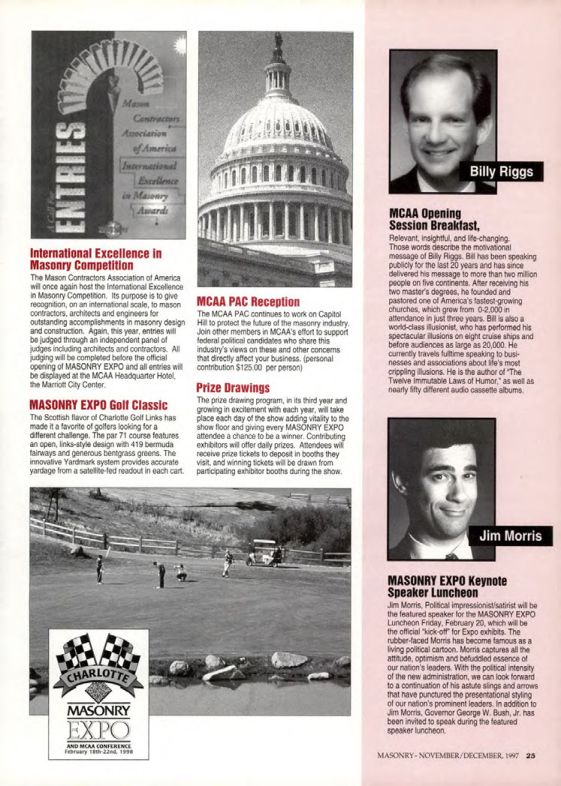 Jim Morris, Political impressionist/satirist will be the featured speaker for the MASONRY EXPO Luncheon Friday, February 20, which will be the official "kick-off for Expo exhibits. The rubber-faced Morris has become famous as a living political cartoon. Morris captures all the attitude, optimism and befuddled essence of our nation's leaders. With the political intensity of the new administration, we can look forward to a continuation of his astute slings and arrows that have punctured the presentational styling of our nation's prominent leaders. In addition to Jim Morris, Governor George W. Bush, Jr. has been invited to speak during the featured speaker luncheon.