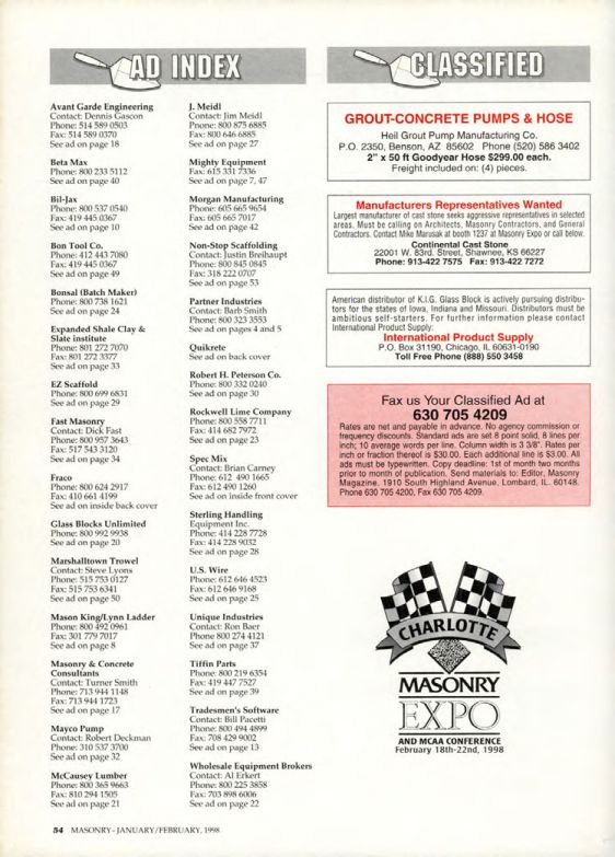 Rates are net and payable in advance. No agency commission or frequency discounts. Standard ads are set 8 point solid, 8 lines per inch; 10 average words per line. Column width is 3 3/8". Rates per inch or fraction thereof is $30.00. Each additional line is $3.00. All ads must be typewritten. Copy deac deadline: 1st of month two months prior to month of publication. Send materials to: Editor, Masonry Magazine. 1910 South Highland Avenue, Lombard, IL. 60148.