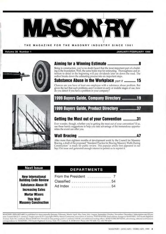 MASONRY (ISSN 0025-4681) is published six times annually (January/February, March/April May/June, July/Augast, September/October, November/December). Subscription rate 500 per year, Canada 524 (US. currency). Single copies $3.50. Copyright 1996 by Mason Contractors Association of America. POSTMASTER Send address changes to MASONRY, 1910 South Highland Avensar, Suite 100, Lombard, Illinois 60148-6163. Periodical class pestage paid in Lombard, II 60148, and additional mailing offices, SEND SUBSCRIPTIONS, advertising, editorial and business correspondence to MASONRY, 1910 South Highland Averve, Suite 101, Lombard, IL 60048-6163 Phone 630/705 4200, Fax: 630/705 4209.