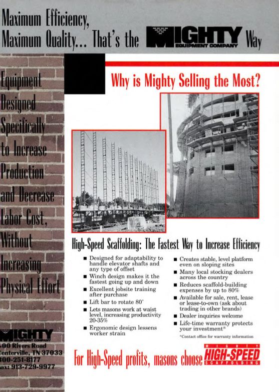 Designed for adaptability to handle elevator shafts and any type of offset. Winch design makes it the fastest going up and down. Excellent jobsite training after purchase. Lift bar to rotate 80°. Lets masons work at waist level, increasing productivity 20-35%. Ergonomic design lessens worker strain.