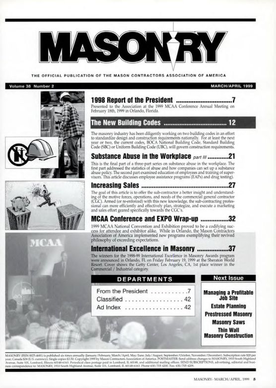 Masonry Magazine April 1999 Page. 5 Masonry Magazine April 1999 Page. 5 MASONRYTHE OFFICIAL PUBLICATION OF THE MASON CONTRACTORS ASSOCIATION OF AMERICAVolume 38 Number 2MARCH/APRIL 1999 1998 Report of the President