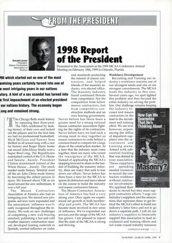 The Mason Contractors Association of America also had an intriguing year. We started new programs, services were expanded and the associations' influence was finally recognized throughout the industry. We took on new challenges of completing a new wall bracing standard, publishing a hot and cold weather masonry construction manual, developed training materials in Spanish, exerted influence on codes and standards protecting the interest of mason contractors, and helped friends of the masonry industry win elected office. The masonry industry faced continued threats from competition. Not the competition from fellow mason contractors, but from competitive construction methods and an over bearing government. Never before has there ere been a greater need for a strong national mason contractor association fighting for the rights of its contractors. Never before have we had such a strong need to stay together as mason contractors to unite behind a common bond to compete for a large share of the construction market. At a time that the industry must come together, there are many who resent the resurgence of the MCAA. Instead of applauding the MCAA's stepping forward to share in the burden of building the masonry industry, there are many that seek to tear down our efforts. Never before has there been a time for the MCAA to ignore its detractors and move ahead on the course to build the industry and mason contractors futures.