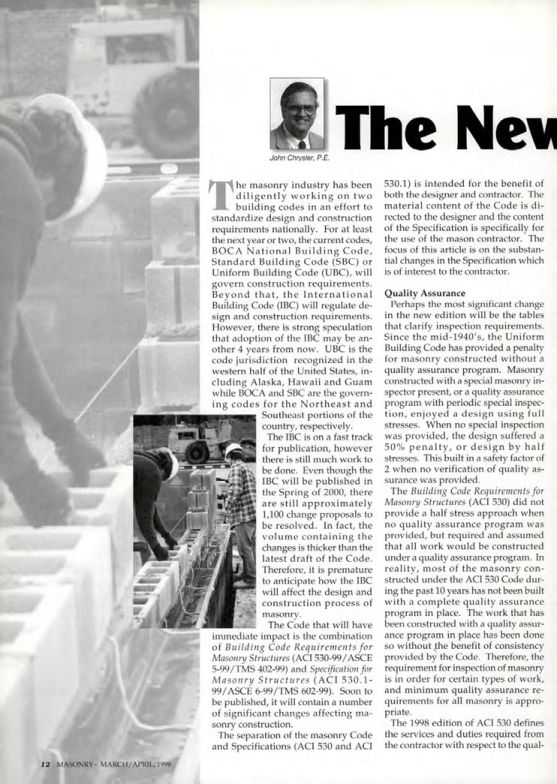 The Code that will have immediate impact is the combination of Building Code Requirements for Masonry Structures (ACI 530-99/ASCE 5-99/TMS 402-99) and Specification for Masonry Structures (ACI 530.1 99/ASCE 6-99/TMS 602-99). Soon to be published, it will contain a number of significant changes affecting masonry construction.