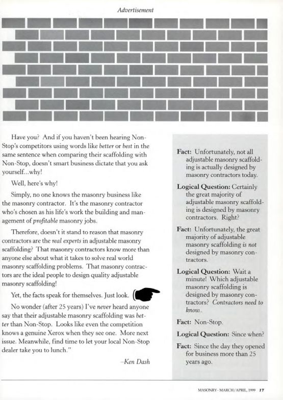 No wonder (after 25 years) I've never heard anyone say that their adjustable masonry scaffolding was better than Non-Stop. Looks like even the competition knows a genuine Xerox when they see one. More next issue. Meanwhile, find time to let your local Non-Stop dealer take you to lunch.