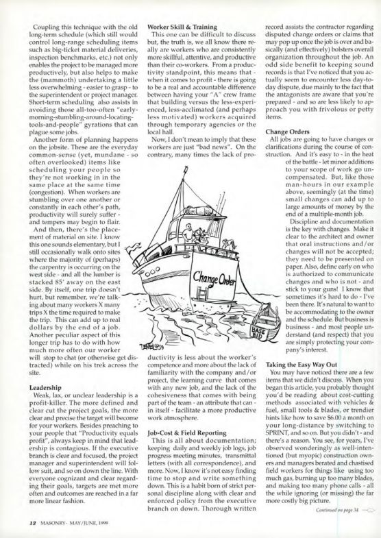 And then, there's the place-ment of material on site. I know this one sounds elementary, but I still occasionally walk onto sites where the majority of (perhaps) the carpentry is occurring on the west side and all the lumber is stacked 85' away on the east side. By itself, one trip doesn't hurt, but remember, we're talk-ing about many workers X many trips X the time required to make the trip. This can add up to real dollars by the end of a job. Another peculiar aspect of this longer trip has to do with how much more often our worker will stop to chat (or otherwise get dis-tracted) while on his trek across the site.