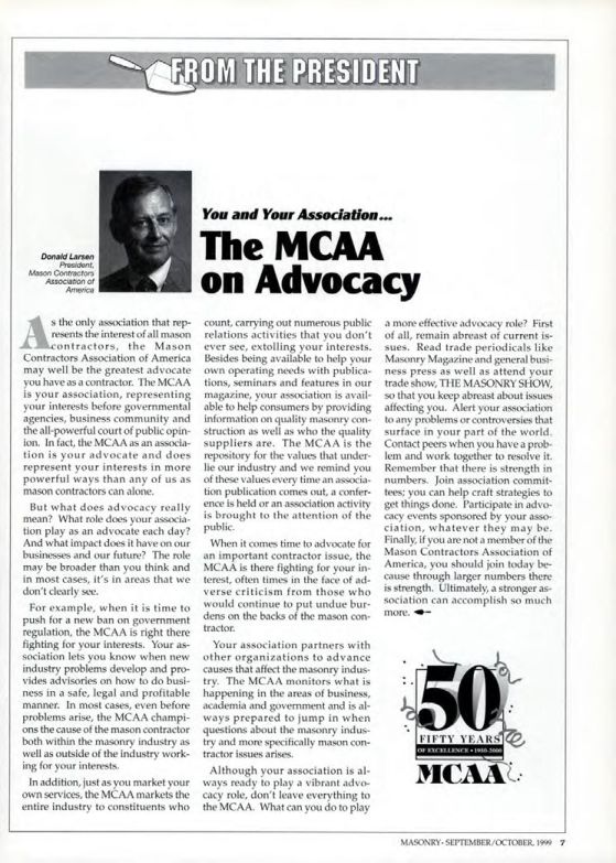 As the only association that represents the interest of all mason contractors, the Mason Contractors Association of America may well be the greatest advocate you have as a contractor. The MCAA is your association, representing your interests before governmental agencies, business community and the all-powerful court of public opinion. In fact, the MCAA as an association is your advocate and does represent your interests in more powerful ways than any of us as mason contractors can alone.