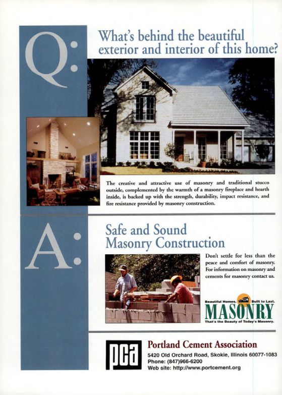 The creative and attractive use of masonry and traditional stucco outside, complemented by the warmth of a masonry fireplace and hearth inside, is backed up with the strength, durability, impact resistance, and fire resistance provided by masonry construction.