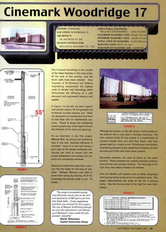 This Cinemork Woodridge is the newest of the three theaters in this case study. At the time of this printing, only the block walls have been erected. Tony Chapman of TK Architects and Walloce Engineering incorporated the highest order of slender wall technology which demonstrate the efficiency of a well designed and engineered masonry wall system.